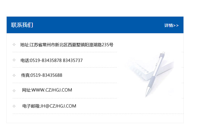 地址:常州市新北區友邦商務大廈1幢16、17層  電話:0519-85101652  傳真:0519-85112595  郵編:213022  網址:www.cz-jiayue_cn.zswangjia.com  郵箱:xiajifengaa@163.com